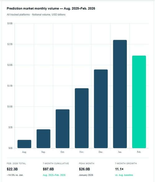Prediction markets have exploded from niche election curiosities into a multi-billion-dollar parallel sports-betting channel. Kalshi posted roughly $17–24 billion in notional volume in 2025 (85–87% sports), while Polymarket reached $21.5 billion overall (sports ~39% globally, nearly 100% on its U.S. app). Combined monthly trading volume for the two platforms surged to nearly $18 billion in February 2026 and hit a record $26 billion in January 2026, with Kalshi alone handling more than $2 billion per week ahead of the Super Bowl. Valuations followed: Kalshi hit an $11 billion mark, Polymarket $8 billion, fueled by venture inflows and retail/crypto traders who treat contracts like liquid equities rather than traditional parlays.
