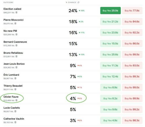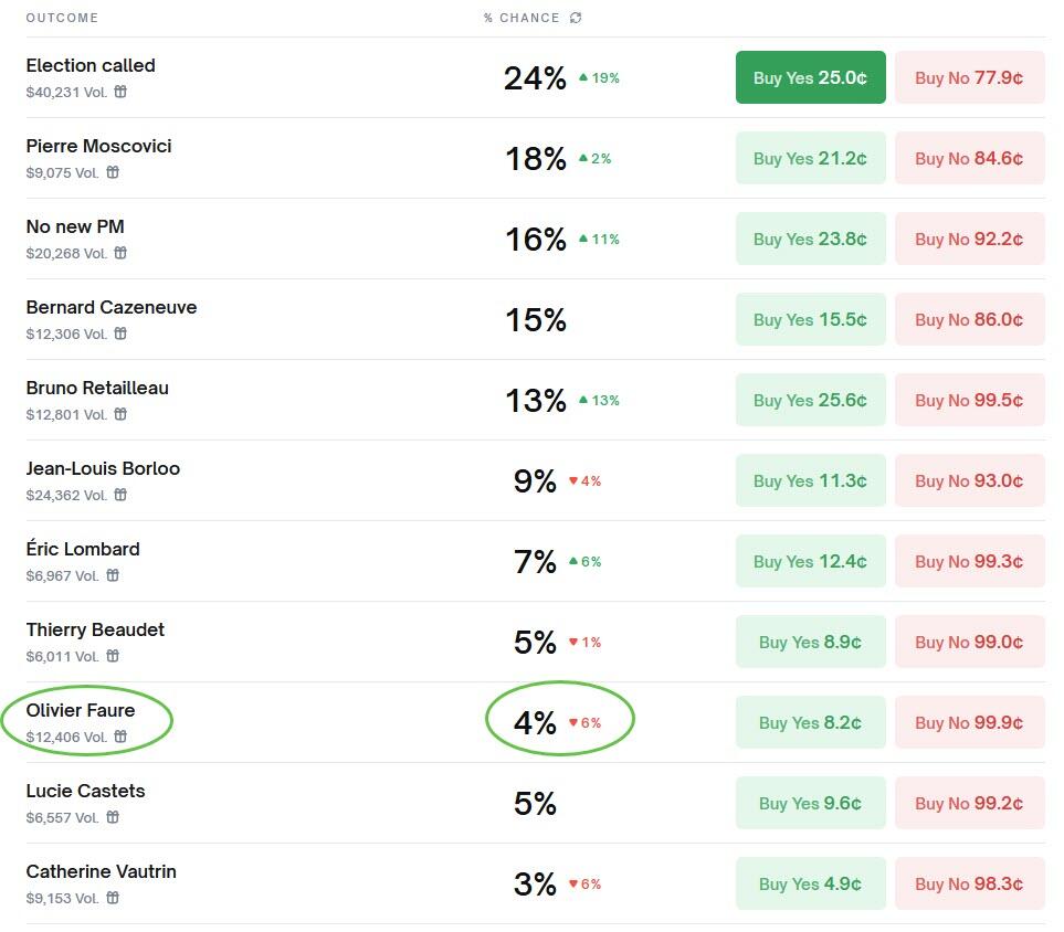 However, cryptocurrency-based prediction market Polymarket has socialist prime minister Bernard Cazeneuve at 30% odds, with Jean-Louis Borloo at 22.9%, and Pierre Moscovici at 13.3%.