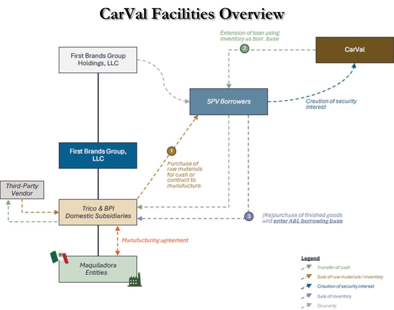 Separately, First Brands appointed two independent directors to probe how the company financed itself through these opaque off-balance sheet vehicles, summarized in the charts below. The company, which makes windshield wipers and fuel tank pumps for cars, had relied on a web of financiers to fund its operations and a wave of acquisitions.