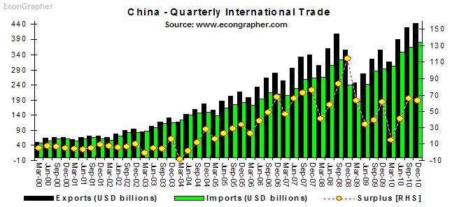 Yet look at the graph above, the dip in the China surplus is not as large as is implied the by headlines and their recent monthly trade reports. Even more telling, over all China's imports rose 39% while exports increased 31% for all of 2010.